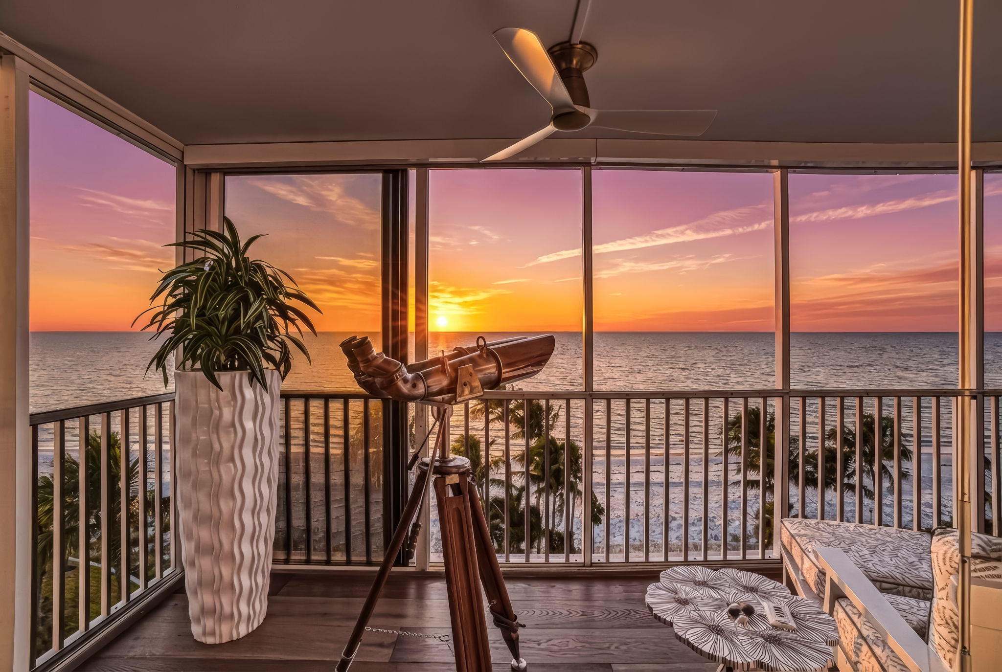 Experience a luxurious beachfront lifestyle at Martinique Club in The Moorings, an intimate Gulf front building offering just 35 private residences. This magnificently updated seventh floor end unit captures panoramic views spanning the Gulf, Venetian Bay, and the Naples skyline, delivering breathtaking sunsets, warm coastal breezes, and an abundance of natural light throughout. Spanning over 2,300 square feet, the well thought out floor plan features three bedrooms and three bathrooms, with expansive living and dining areas that flow seamlessly to a screened and enclosed balcony creating an ideal space for entertaining. The kitchen is beautifully appointed with custom cabinetry and countertops and high end appliances. All bedrooms offer ensuite bathrooms, generous closet space, and stunning water views. Additional features include electric shutters, impact glass windows, custom built ins with cedar drawers, automatic shades on every window, in residence laundry, extra storage, and a deeded parking space. Martinique Club offers private beach access, a beachfront pool, poolside cabana room, outdoor grills, and a newly renovated secure lobby, with no land lease in place. Ideally located just steps from Venetian Village’s upscale dining and boutiques and minutes to Waterside Shops, Artis Naples, Mercato, and Naples iconic Fifth Avenue South and Third Street South, this residence represents coastal elegance at its finest.